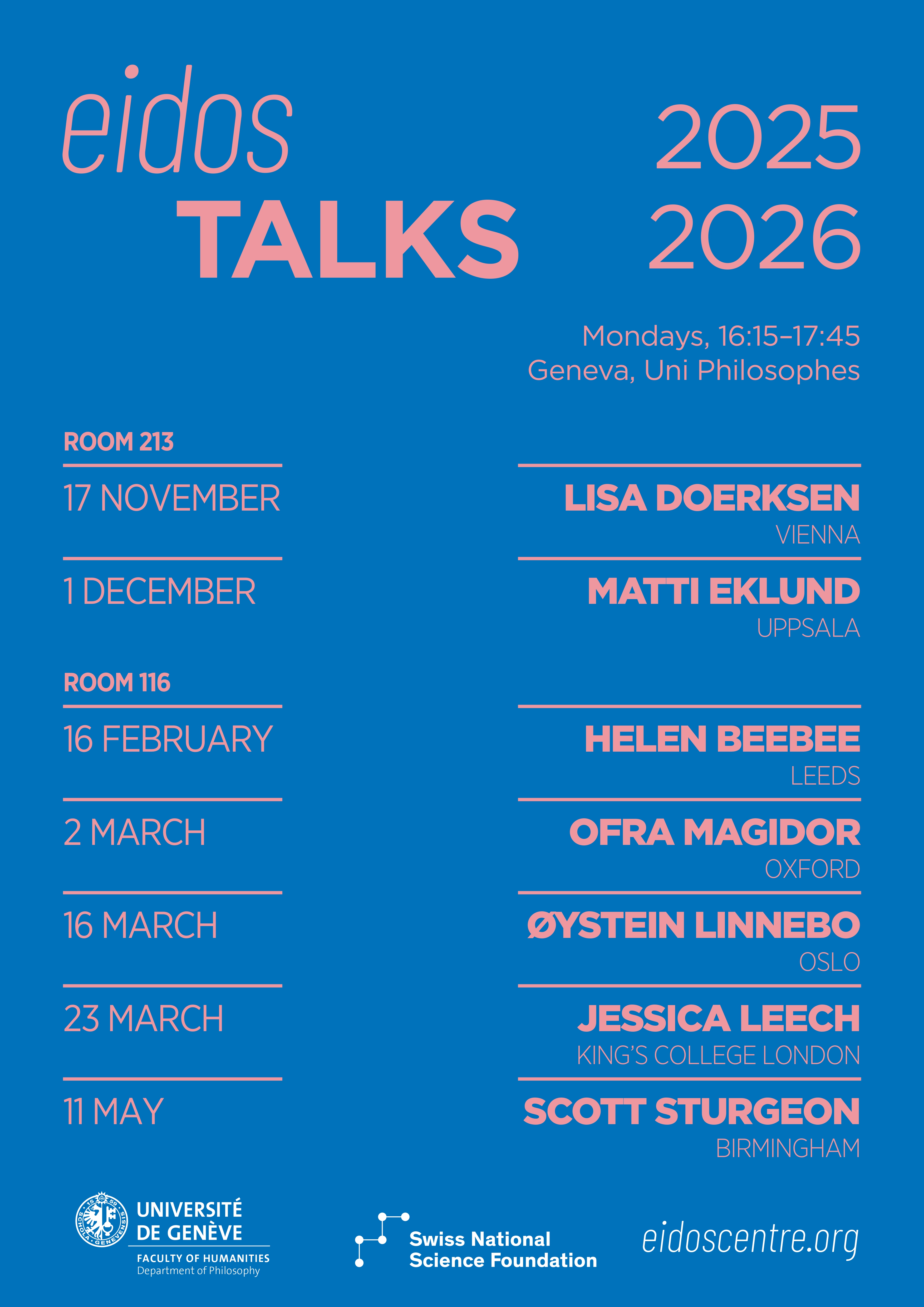 eidos, the Centre for Metaphysics, was founded in 2007 by Fabrice Correia and Kevin Mulligan, with the invaluable help of Philipp Blum, and has been since then directed by its founders, now joined by Giovanni Merlo. Based in Geneva since its inception, it had a branch in Neuchâtel from August 2012 to July 2017, and it has a new branch in Lugano. eidos encourages collaboration with other fields, disciplines and universities.
